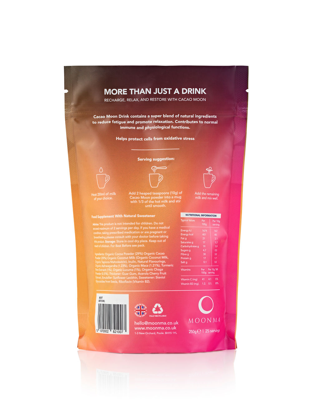 The super blend of ingredients in Cacao Moon have been carefully and scientifically selected and tested by food technologists, creating the most delicious Cacao drink mix that benefits not just the body but also the mind, helping to restore balance and function, leaving you feeling more focused, rejuvenated & calm